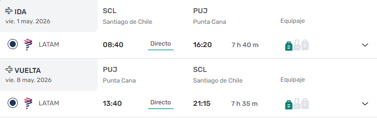 - Ticket Aéreo Santiago / Punta Cana/ Santiago vía LATAM DIRECTO.