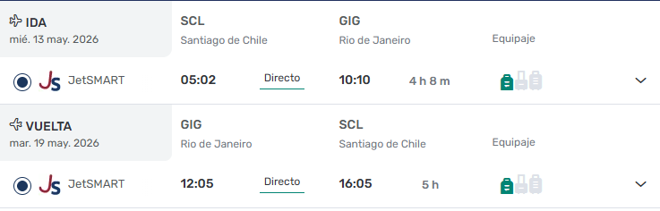 - Ticket Aéreo Santiago / Rio de Janeiro/ Santiago vía JETSMART. DIRECTO