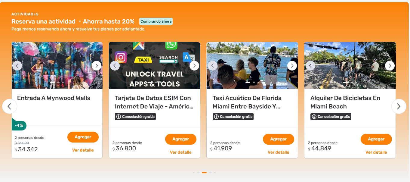 Viajar a Miami nunca fue tan fácil. Con nuestros paquetes turísticos tienes todo organizado antes de salir de casa: vuelos, hotel y la posibilidad de agregar extras como traslados, actividades, arriendo de autos o seguro de viaje. Así solo te preocupas de disfrutar.