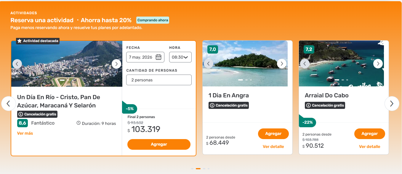 Viajar a Río nunca fue tan fácil. Con nuestros paquetes turísticos tienes todo organizado antes de salir de casa: vuelos, hotel y la posibilidad de agregar extras como traslados, actividades, arriendo de autos o seguro de viaje. Así solo te preocupas de disfrutar.