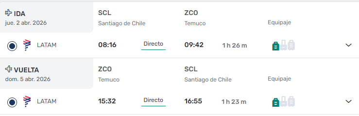 • Ticket Aéreo Santiago / Temuco/ Santiago vía LATAM. ULTIMOS CUPOS